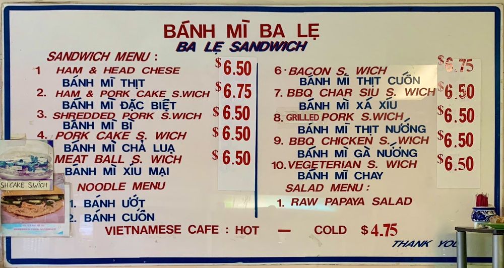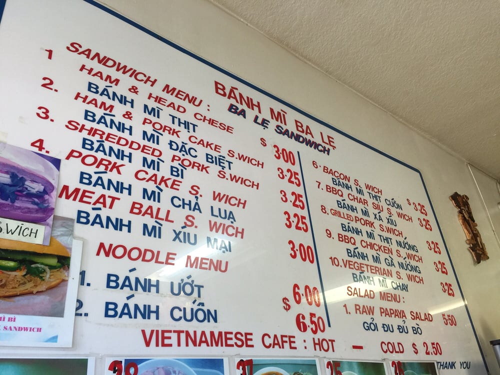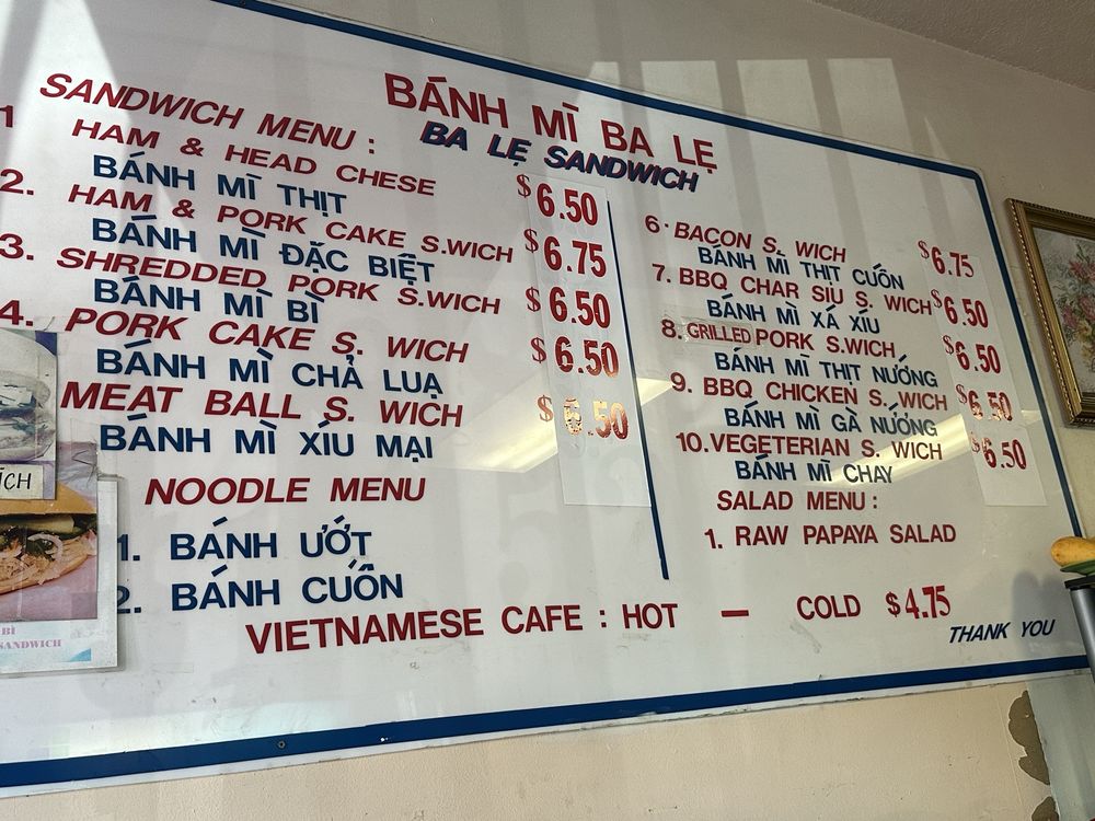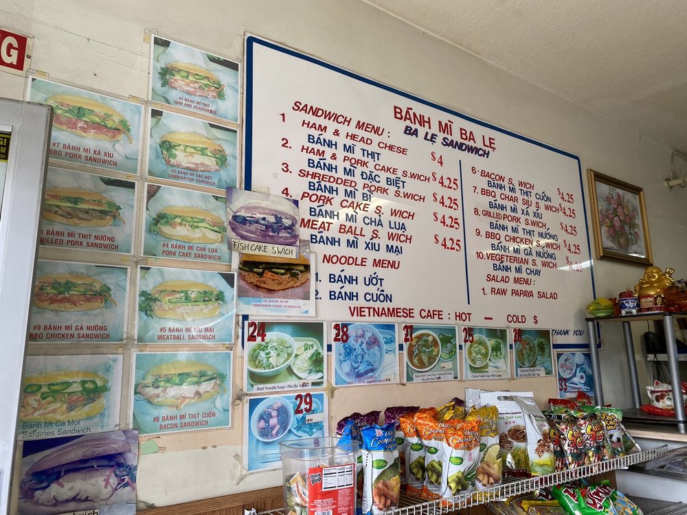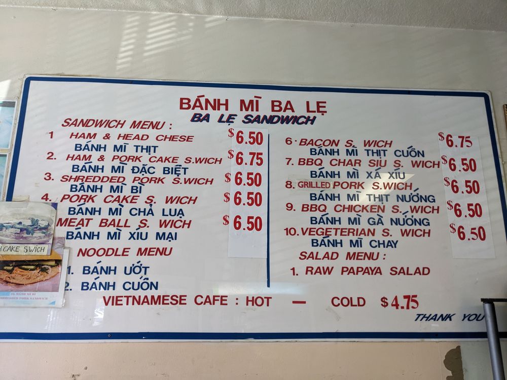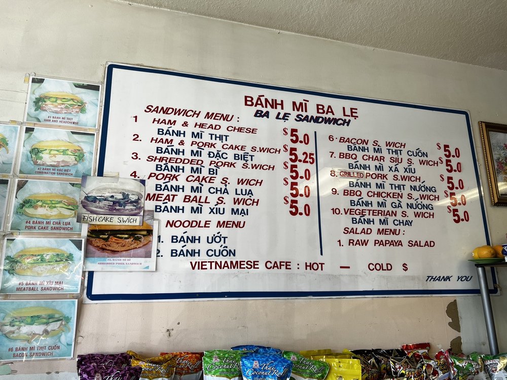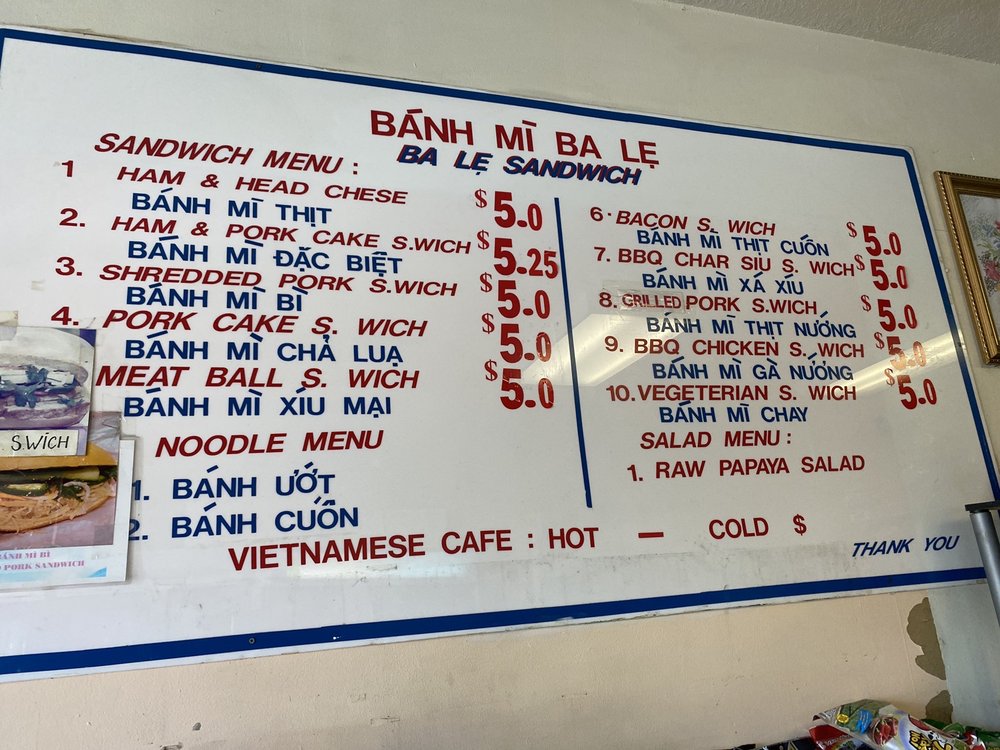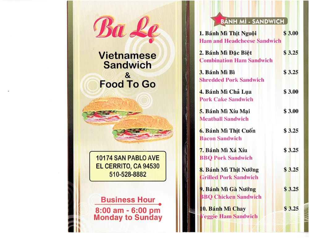 Introducing the menu at Banh Mi Ba Le Vietnamese Sandwich Deli, a humble mom and pop shop in El Cerrito, CA, offering a variety of tasty dishes. With options such as BBQ char siu sandwiches, grilled pork sandwiches, and cold cut combos, this spot is a go-to for delicious Banh Mi. Customers rave about the flavorful and smoky meats, soft and flaky bread, and the homemade feel of the sandwiches. While the menu may be small, the quality and taste are top-notch. Don't forget to bring cash as this cash-only establishment serves up affordable and filling meals. Whether you're a Banh Mi enthusiast or a first-time visitor, Banh Mi Ba Le is sure to impress with its authentic Vietnamese flavors and friendly service.